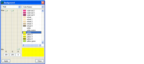 4. Scroll down the color list to select Yellow. Click Apply in the Background panel to validate this change. Then click Close to close this window.
