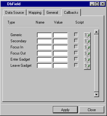 Some Data Access gadgets have additional callbacks, which are listed in this manual. Descriptions of the callbacks are located in the Rogue Wave Views Data Access Reference Manual.