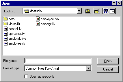 Note: On Unix, this dialog box is called a File Selector. In Windows, it is called Open, as illustrated below. |