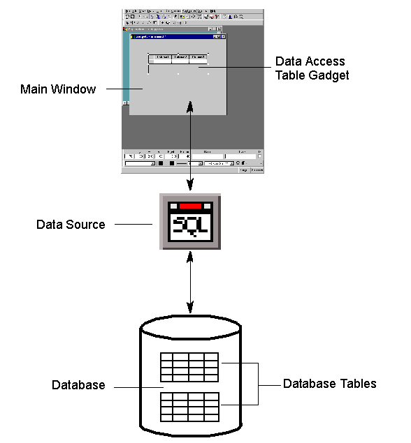 The following diagram shows how the data source is related to both the database tables and the table gadgets: