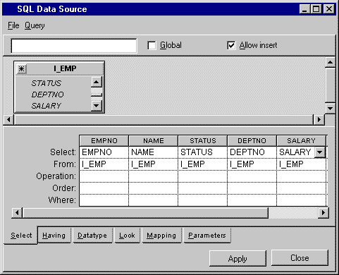 SELECT section—the area that allows you to define a data source table. To do this, the data source applies your selection and your display criteria to the values taken from the database tables represented in the FROM section. Using these criteria, the data source computes a table that it places in the data cache for later display or editing of the database.
