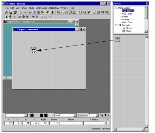 You can also use the graphics capabilities of Rogue Wave Views Studio to enhance your application. All the functionality of Data Access can be accessed from the gadgets in the Palettes panel (except the Data Access SQL Schema Editor). For a description of these palettes, see