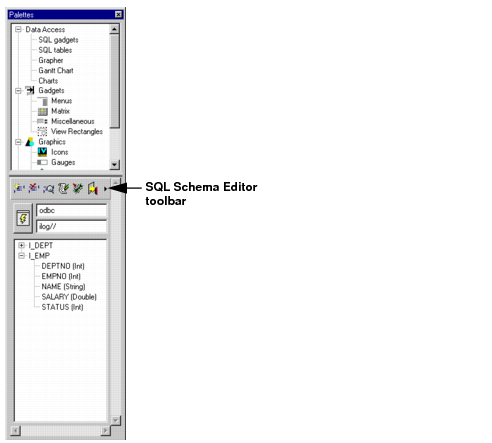 The Palettes panel contains the Data Access gadgets especially designed for Data Access applications and is entirely integrated into Rogue Wave® Views. When you launch Data Access with dbstudio or dynamic launching via ivfstudio, the Palettes panel appears with the Main window. The command Palettes in the Tools menu opens the Palettes panel if it is closed.