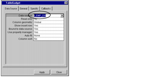 3. In the Table Gadget inspector panel choose the data source to which the gadget is to be connected.
