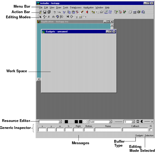 Work Space—Use this large rectangular area to edit your panels. Two empty buffer windows (Gadgets and Application) are displayed by default when Data Access is launched. You can open new buffer windows at any time by choosing New from the File menu and then the type of buffer window you want (Gadgets, 2D Graphics, and Grapher). Only one Application buffer window can be open at a time. Buffer windows have buttons in the top-right corner that you can use to maximize, minimize, or close them.