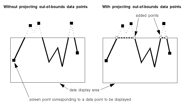 Figure 8.3 shows how out-of-bounds data points are handled. The parts of the polyline extending outside of the data display area are projected. Points are added (those shown by white circles) in order to close the polyline that was truncated in the drawing on the left. The polyline then appears to be continuous with the projected parts following the limits of the data display area.