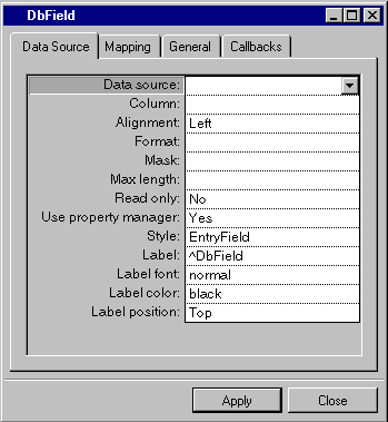 Use property manager | Menu: Yes, No. Default: Yes. Explanation: Yes = The DbField gadget uses a property manager. No = The DbField gadget does not use a property manager. |