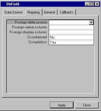 Completion | Menu: Yes, No. Default: Yes. Explanation: Is in effect only when constrained = Yes. Yes = Can enter a DbField item by typing enough of its initial characters to make it unique, then validating it or leaving the cell. No = Cannot enter a DbField item by typing its unique initial characters. |