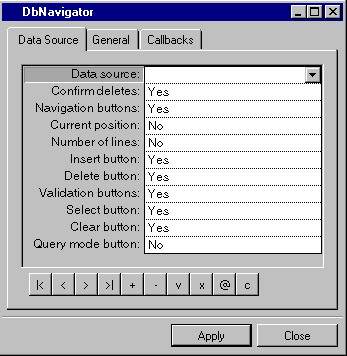 Data source | Menu: Names of current data sources. Default: No default. Explanation: Name of the data source to which the DbNavigator gadget is to be connected. |