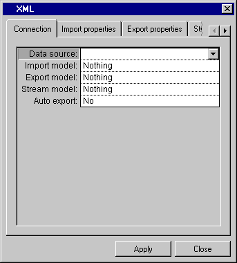 Stream model | Menu: Nothing, File. Default: Nothing. Explanation: The model name that is used to connect to an XML document. |