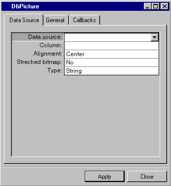 Data source | Menu: Names of current data sources. Default: No default. Explanation: Name of the data source to which the DbPicture gadget is to be connected. |