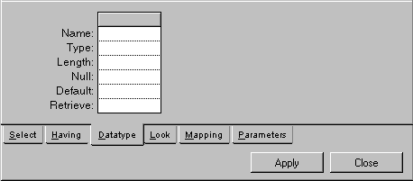 Retrieve | Menu: Yes, No. Default: No default. Explanation: Yes = Column is an element of the data source. No = Column is not an element of the data source and will not appear in the result. Is used only with selection criteria. |