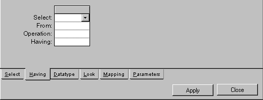 Having | Menu: None. Default: No default. Explanation: Selection criteria applied to the column in the Select row. The selection criteria is used with a logical AND operator and added to criteria in other columns to further restrict the selection of data to be retrieved from the database. Only applies when there is a value in the Operation row. |