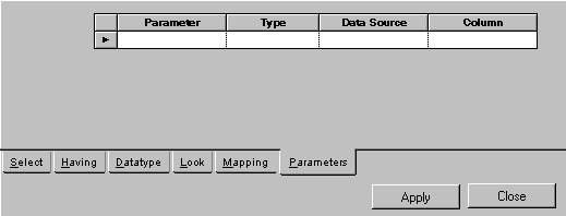 Parameter | Menu: None. Default: No default. Explanation: The name of the parameter that represents the column from which data is to be retrieved. This name can then be used as selection criteria in a Where row on the Select page. |
