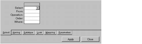 Select | Menu: The columns of the data source table in the From row. Default: No default. Explanation: Defines a data source column taken from the table displayed in the From row or an SQL expression that may include one or more columns. |