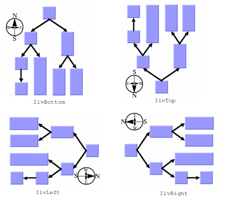 The flow direction parameter specifies the direction of the tree links. The compass icons show the compass directions in these layouts. This is illustrated in