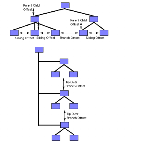 The spacing of the layout is controlled mainly by three spacing parameters: the distance between a parent and its children, the minimal distance between siblings, and the minimal distance between nodes of different branches. For instance, if the flow direction is to the top or bottom, the offset between parent and children is vertical, while the sibling offset and the branch offset are horizontal.