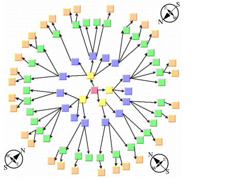 Figure 4.15 shows an example of the radial layout mode. The compass icons show the compass directions in this drawing.