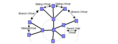 Note that the sibling and branch offsets are minimal distances tangential to the circles or ellipses, while the parent-child offset is a minimal distance radial to the circles or ellipses.