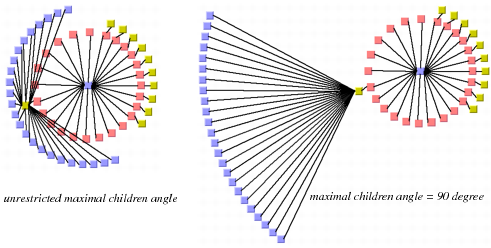 If a node has many children, they may cover a major part of the circle, and hence are placed nearly 360 degree around the node. This can result in links overlapping other nodes. The deficiency can be fixed by increasing the offset between parent and children. However, this influences the layout globally, also affecting nodes without the deficiency. To avoid a global change, you can limit the maximal angle between the two rays from the parent (if it is not the root) to its two outermost children. This increases the offset between parent and children only where necessary. Use the following method to set and obtain the angle in degrees: