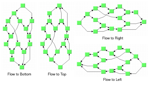 The flow direction parameter specifies the direction in which the majority of the links should point. If the flow direction is to the top or to the bottom, the node levels are oriented horizontally and the links mostly vertically. If the flow direction is to the left or to the right, the node levels are oriented vertically and the links mostly horizontally.
