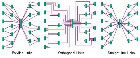 The layout algorithm positions the nodes and routes the links. To avoid overlapping nodes and links, it creates bend points for the shapes of links. The link style parameter controls the position and number of bend points. The link style can be set globally, in which case all links have the same kind of shape, or locally on each link such that different link shapes occur in the same drawing.