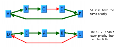 For an example of using the link priority, consider a cycle A->B->C->D->E->A. It is impossible to lay out this graph without reversing any link. Therefore, the layout algorithm selects one link to be reversed. To control which link is selected, you can give one link a lower priority than the others. This link will be reversed. In