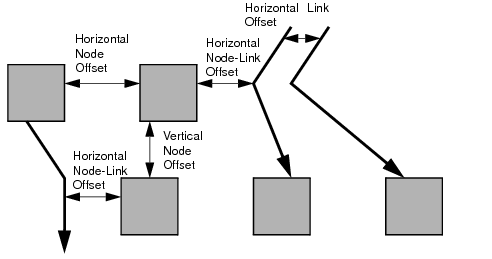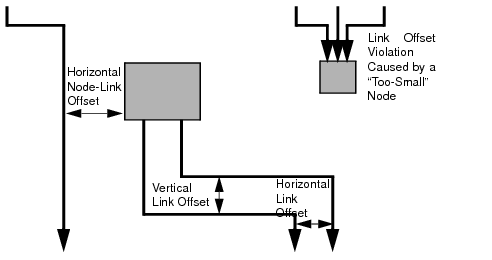 For orthogonal links, the horizontal link offset is the minimal distance between parallel, vertical link segments. The vertical link offset is the minimal distance between parallel, horizontal link segments. However, the layout algorithm cannot always satisfy these offset requirements. If a node is very small but has many incident links, it may be impossible to place the links orthogonally with the specified minimal link distance on the node border. In this case, the algorithm places some link segments closer than the specified link offset.