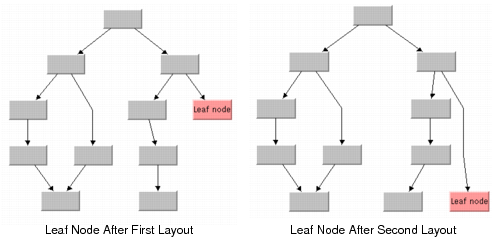Figure 4.36). Since you do not know before laying out the graph how many levels will be created, you cannot specify the highest level index at the beginning. You must perform a first layout, iterate over the nodes, and retrieve the highest calculated level. If the leaf node is not already placed at the highest level index, you must specify this level index for the leaf node while preserving the level and position indices of all other nodes. Then perform the layout a second time. The following code fragment shows how to do this.
