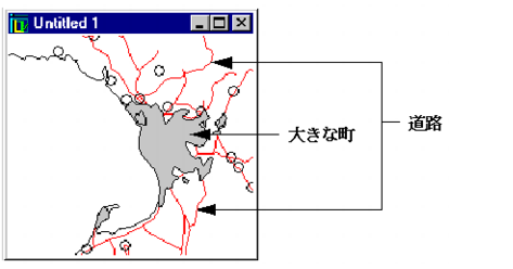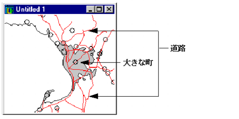 「凡例 (Legend)」ウィンドウの「レイヤー」リスト・ボックスのもっとも下にあるレイヤーが、ビューで最初に表示されるレイヤーです。リスト・ボックスの下から 2 番目のレイヤーは、2 番目に表示されるレイヤーで、その内容は先頭のレイヤーのオブジェクトで隠れる場合があります。バッファーにある地図の場合、道路レイヤーは大きな町のレイヤーの下にあります。