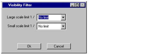 地図作成時に、特定タイプの情報を表示するレイヤーが、特定の縮尺でのみ表示されるようにする場合があります。たとえば、道路インフラストラクチャーについて、地図を特定の縮尺に拡大したときだけ二次道路を表示したい場合があります。「レイヤーのポップアップ・メニューから「可視性フィルター (Visibility filters)」オプションを選択することで、これが指定できます。