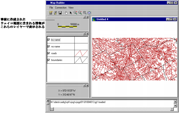 テキサス州ウェイコ地域の道路と町は、完全に重ね合わされています。それを確かめるため、マップ・ビルダーのメイン・ウィンドウの左 (「凡例」パネル) に表示される、「roads」(道路レイヤー) のチェック・ボックスをオフにして、それを非表示にします。オフにすると同時に、ベクトル地図 (基本構造地図) の道路が下になります。