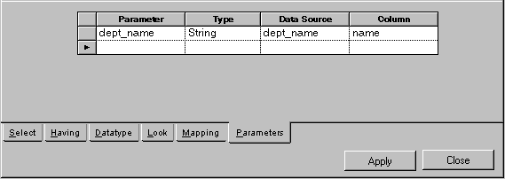 A parameter is defined in the SQL Data Source inspector on the Parameters page. In the table on the Parameters page, you can enter as many parameters as you need.