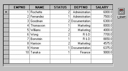 You will start with a table resembling the one shown in the following figure, that is, an SQL data source connected to a table gadget that shows the I_EMP database table: