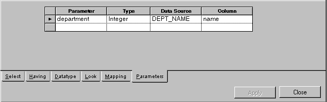 Note: When a parameter is used, its name must be prefixed by a colon (for example, = :department). |