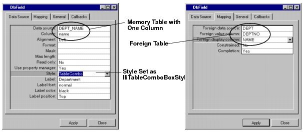 Figure 8.5 The Data Source and Mapping pages of the DbField Inspector that Accepts the Parameter Input