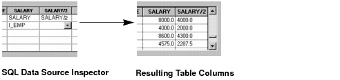 It is also possible to specify a column in the data source table that is the result of a calculation carried out on data from other table columns. This is possible within the limits of the formulas that are accepted by the database. See your database documentation for more information on the formulas that can be used.