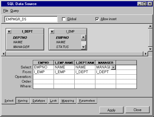3. Click the Select page of the SQL Data Source inspector. From the I_EMP table, add the EMPNO and NAME columns (but not the DEPTNO, STATUS nor SALARY columns) to the EMPMGR_DS data source by dragging lines from the tables in the FROM section to the SELECT section.