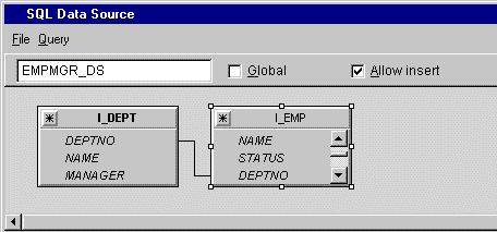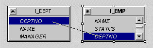 2. In the FROM section of the SQL Data Source inspector panel, drag a line from the DEPTNO label of the I_EMP table to the DEPTNO label of the I_DEPT table: