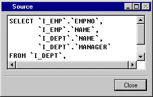 4. To view the SQL source file that reflects the operation you just performed, choose View Source... in the File menu of the EMPMGR_DS SQL Data Source inspector: