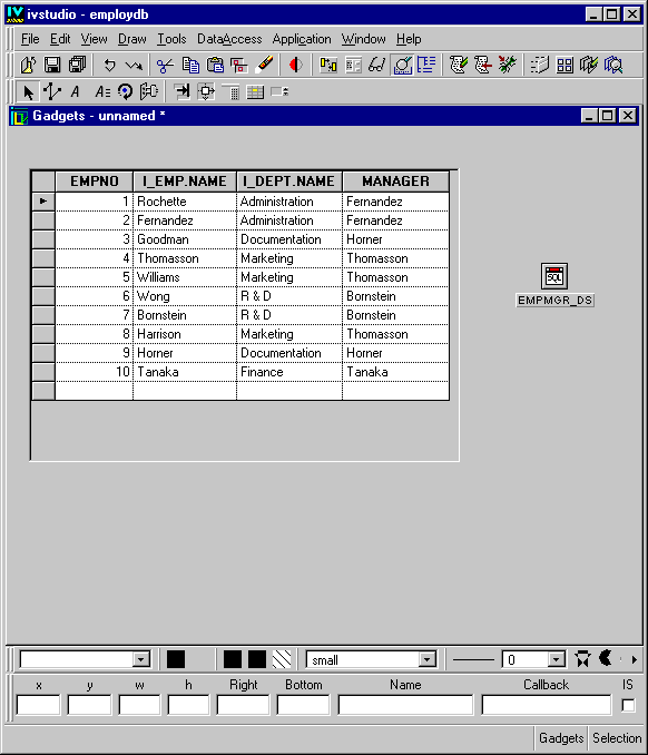 , click the EMPMGR_DS SQL data source gadget to make the SQL Data Source inspector appear.