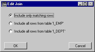Outer Joins (Left or Right): In addition to rows that have matching values in the joined columns, the rows of one of the tables that do not have a matching value in the column of the other table are displayed. These additional rows have empty cells in the columns where they do not have a value. A join like this is shown with a small black dot that indicates the table whose extra rows will be displayed. To select an outer join, select the appropriate radio button in the Edit Join panel.
