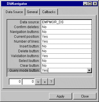 2. You want your DbNavigator gadget to have the following buttons: Current Position, Number of Lines, Validate, Cancel, and Query Mode. Use the settings as shown in the following DbNavigator inspector to modify the DbNavigator gadget: