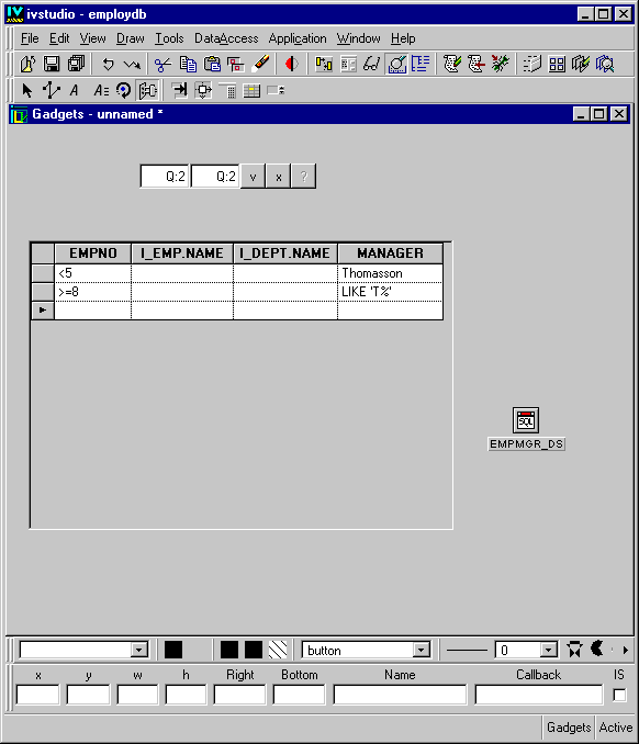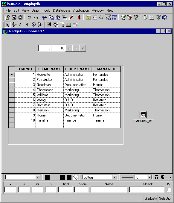in the Main window. Drag a DbNavigator gadget from the Data Access palette of the Palettes panel to the Gadgets buffer. Connect it to the EMPMGR_DS data source using the DbNavigator inspector.