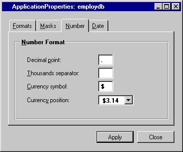 Numbers: Use the Number page in the Application inspector panel to define settings for the decimal point and thousands separator as well as a currency symbol and its placement. These settings are always applied when they are appropriate for the value. The settings also apply to number formulas typed in the Format cell and with predefined user number formats.