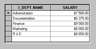 The I_EMP table gadget in the Gadgets buffer changes to display the name of each department along with the highest salary in that department.