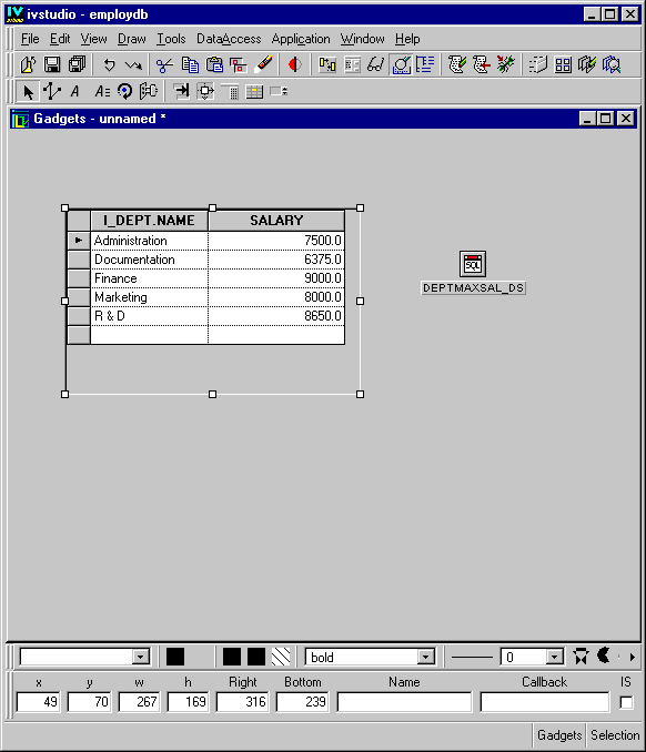 , double-click the DEPTMAXSAL_DS SQL Data Source gadget in the Gadgets buffer.
