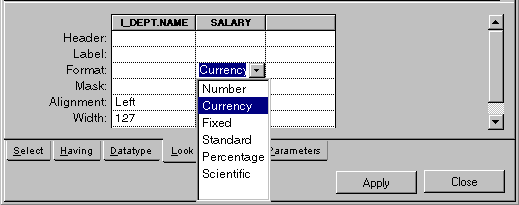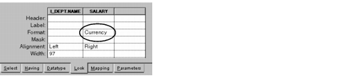5. On the Look page, choose Currency in the combo box menu of the Format cell of the Salary column.
