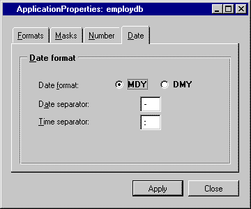 Dates: Use the Date page in the Application inspector panel to define the order of the month and date and the date and time separator symbols. These settings are applied with predefined date and time system formats that appear in the Format cell combo box menu when Date is used in the Datatype cell. The settings also apply to date formulas typed in the Format cell and with predefined user date formats.