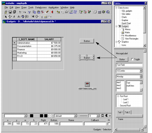 Note: If a gadget is not already connected to the data source, you must enter the data source name as a parameter in the Callback field (in this case, DEPTMAXSAL_DS). If you used Rogue Wave Views Data Access gadgets that you already connected to the data source (in the Data Source cell of the gadget inspector panel), you would just enter the Callback name without the data source parameter, for example: @Select. |